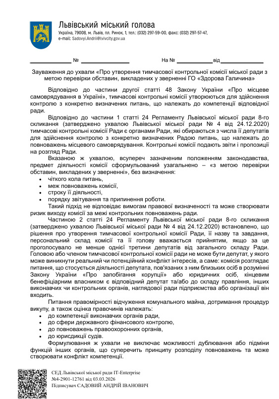 При цьому мер нахабно ігнорує той факт, що його власна, «ручна» комісія виявилася абсолютною фікцією. Відповідно до пункту 2 його ж розпорядження, звіт про результати роботи мав бути поданий ще до 17 лютого 2026 року. Жодних слідів її діяльності, висновків чи звітів у природі просто не існує. Це була лише бюрократична ширма, створена виключно для замилювання очей та затягування часу.