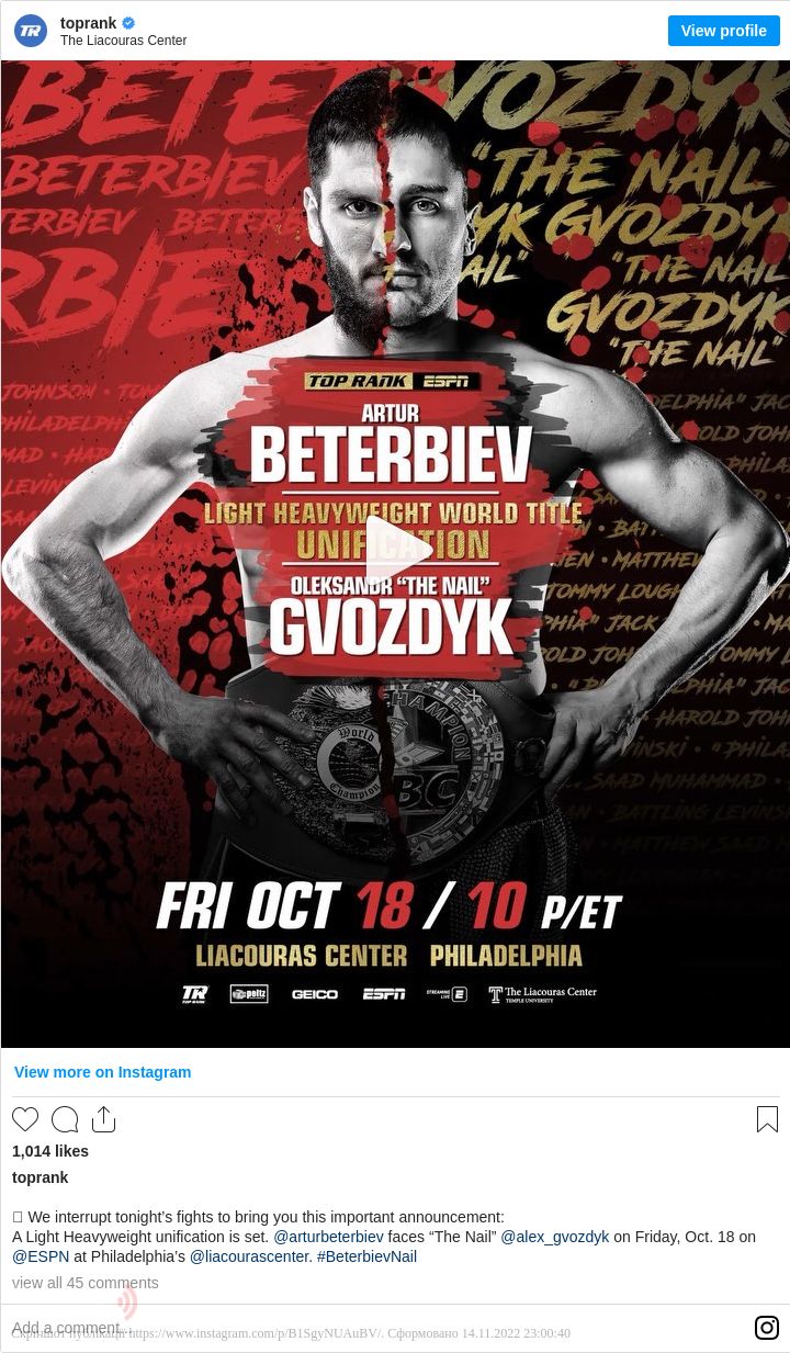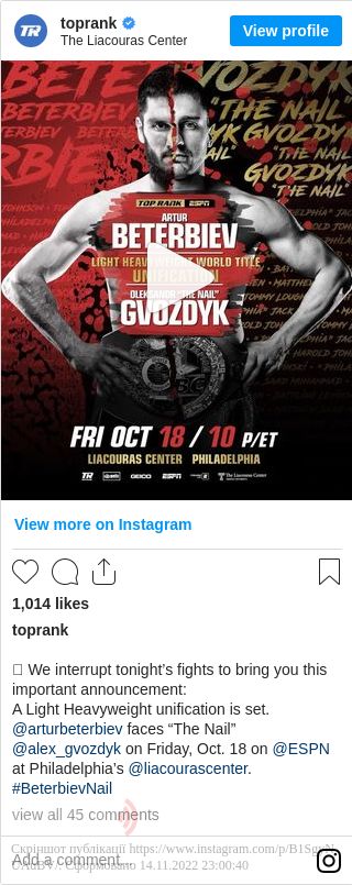 Промоутерська компанія Top Rank офіційно підтвердила бій українського боксера, чемпіона світу за версією WBC у напівважкій вазі Олександра Гвоздика з росіянином Артуром Бетербієвим, який володіє поясом IBF.