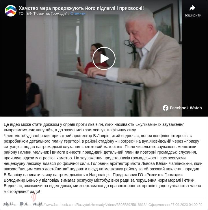 Зважаючи на відеодоказ, активісти звертаються до правоохоронних органів щодо хуліганства члена містобудівної ради.