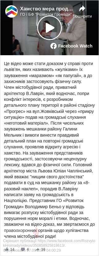"Член містобудівної ради, приватний архітектор Володимир Лаврін, який водночас, попри конфлікт інтересів, є розробником детального плану території в районі стадіону «Прогрес» на вул. Жовківській, через «прикру ситуацію» подав на громадські слухання «неготовий матеріал».