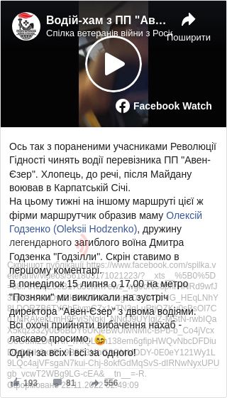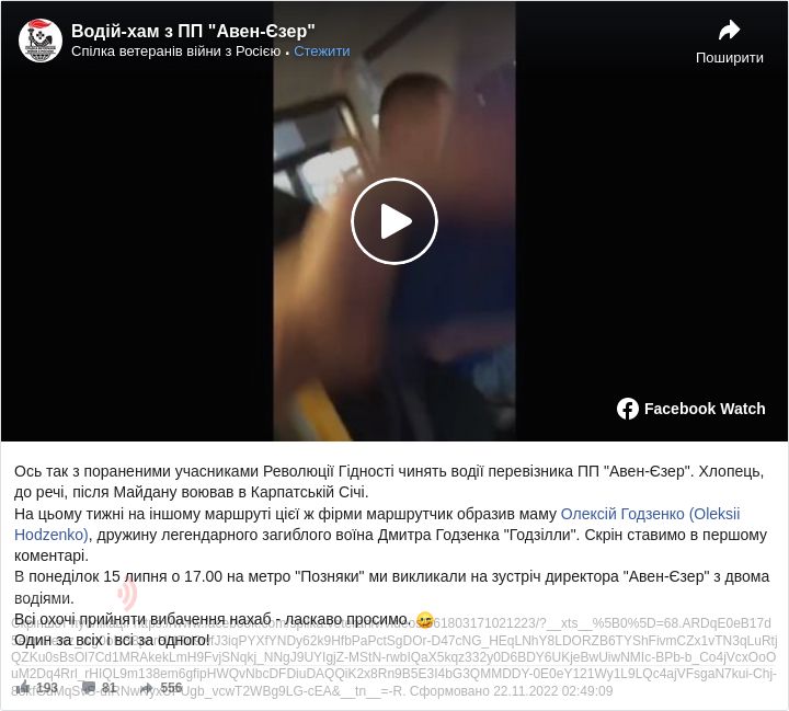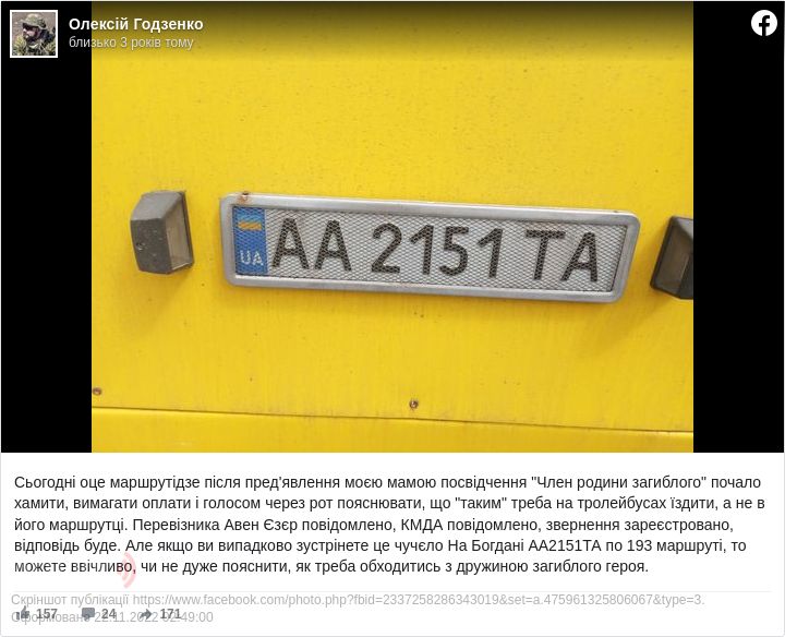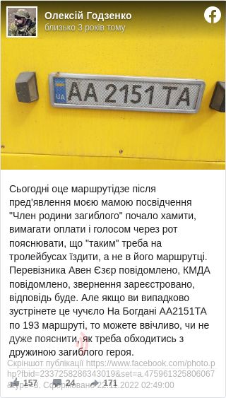 «Оце маршрутідзе після пред'явлення моєю мамою посвідчення «Член родини загиблого» почало хамити, вимагати оплати і голосом через рот пояснювати, що «таким» треба на тролейбусах їздити, а не в його маршрутці. Перевізника «Авен Єзєр» повідомлено, КМДА повідомлено, звернення зареєстровано, відповідь буде. Але якщо ви випадково зустрінете це чучєло на «Богдані» АА2151ТА по 193 маршруті, то можете ввічливо чи не дуже пояснити, як треба поводитись з дружиною загиблого героя.