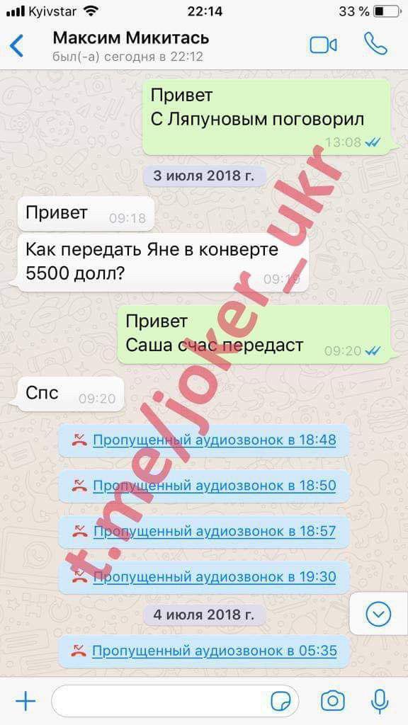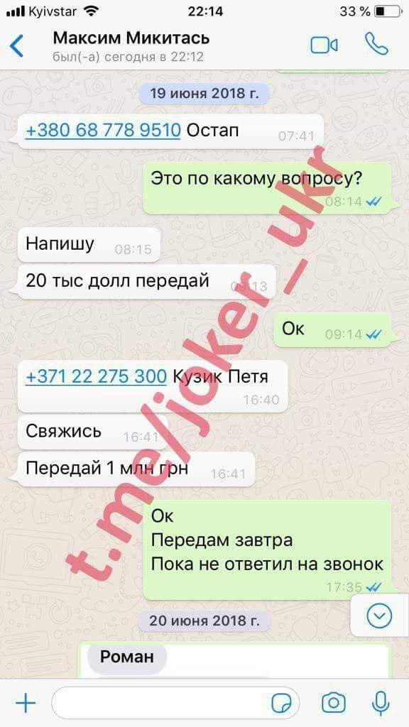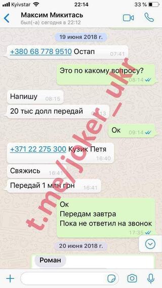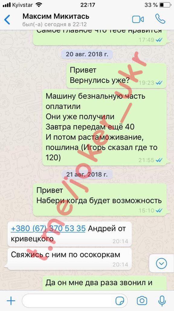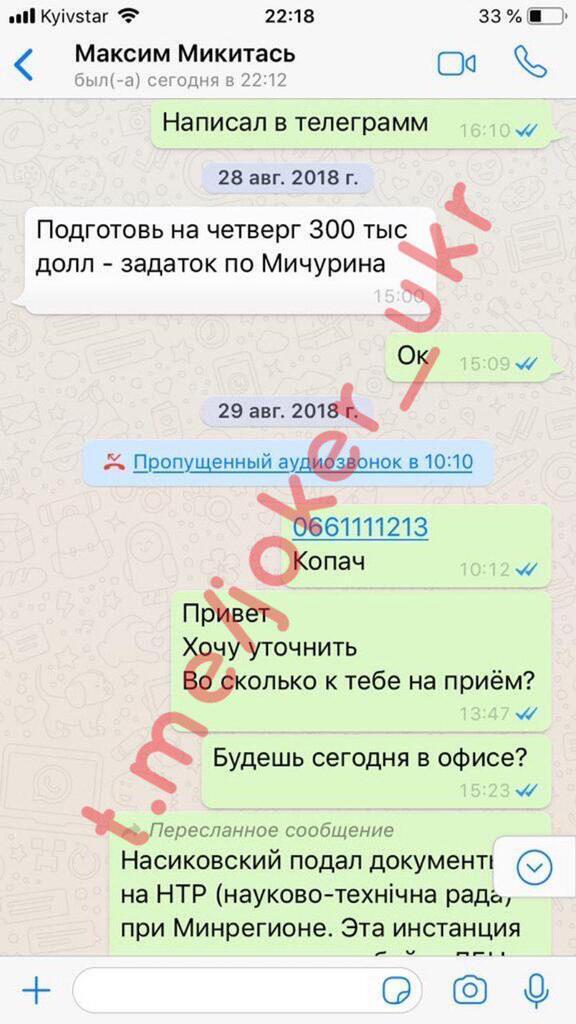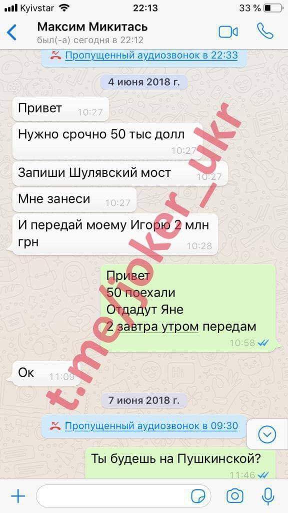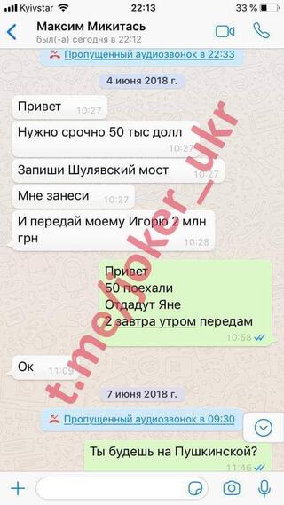 Переписка стосується афер Микитася. З повідомлень зрозуміло, що він регулярно просив гроші на певні витрати.