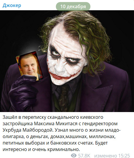 Пранкер «Джокер» оприлюднив переписки генерального директора корпорації «Укрбуд» Олега Майбороди і скандального забудовника Максима Микитася.