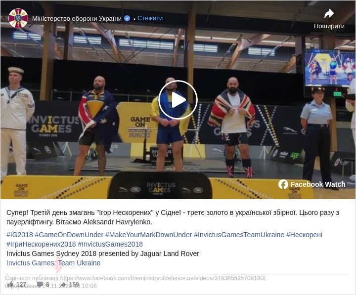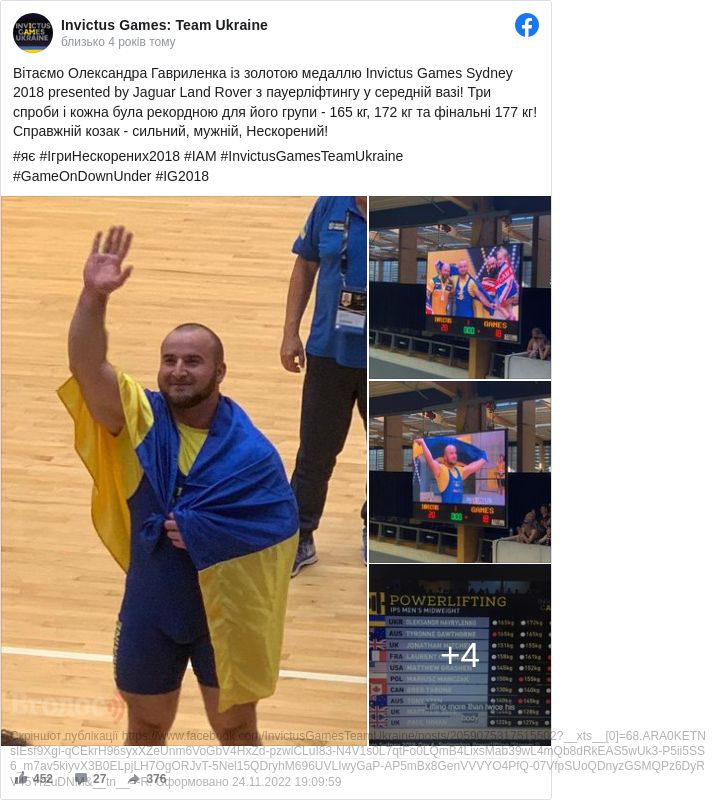 Український воїн Олександр Гавриленко у третій день «Ігор нескорених» здобув нагороду найвищого ґатунку з паверліфтингу у середній вазі.