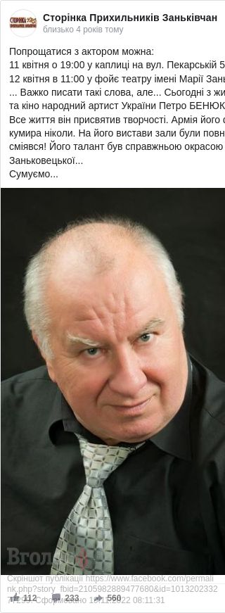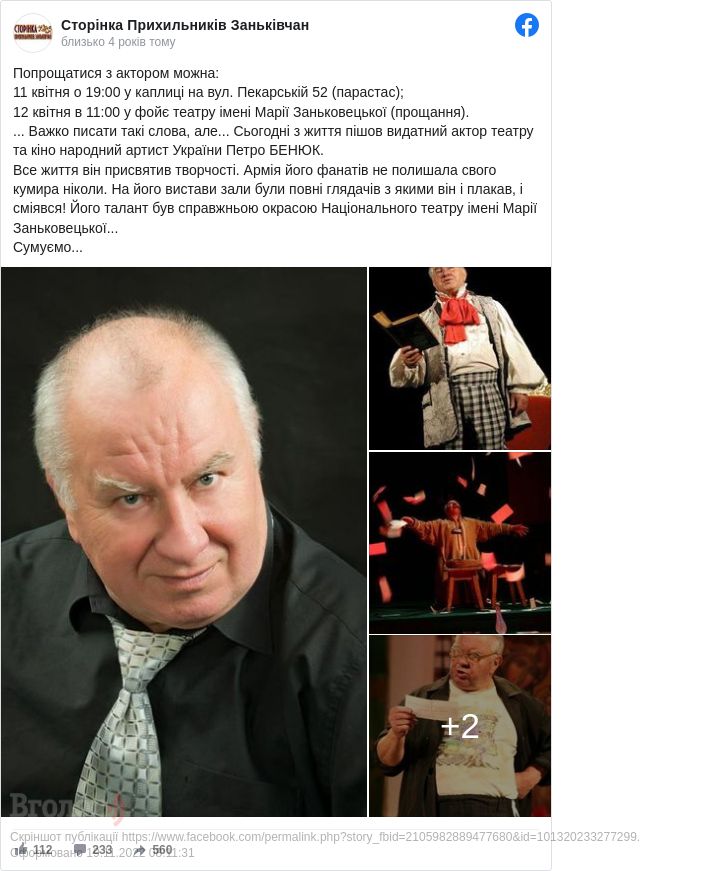 "Все життя він присвятив творчості. Армія його фанатів не полишала свого кумира ніколи. На його вистави зали були повні глядачів з якими він і плакав, і сміявся! Його талант був справжньою окрасою Національного театру імені Марії Заньковецької...Сумуємо...", - зазначено у дописі.