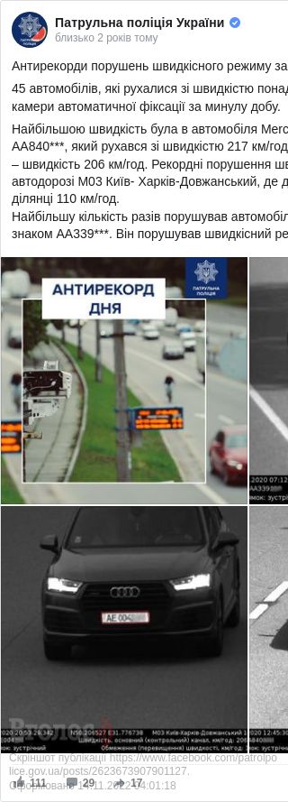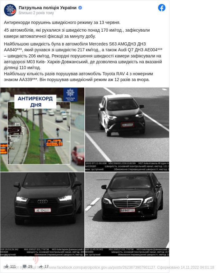 "45 автомобілів, які рухалися зі швидкістю понад 170 км/год, зафіксували камери автоматичної фіксації за минулу добу. Найбільшою швидкість була в автомобіля Mercedes S63 AMG ДНЗ АА840***, який рухався зі швидкістю 217 км/год, а також Audi Q7 ДНЗ АЕ004*** – швидкість 206 км/год. Рекордні порушення швидкості камери зафіксували на автодорозі М03 Київ – Харків – Довжанський, де дозволена швидкість на вказаній ділянці 110 км/год", – ідеться у повідомленні.