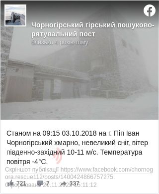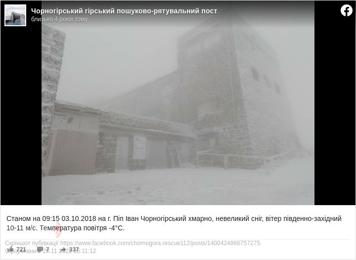 «Станом на 09:15 3 жовтня Піп Іван Чорногірський — хмарно, невеликий сніг, вітер південно-західний 10-11 м/с. Температура повітря –4°С», — зазначається у повідомленні.
