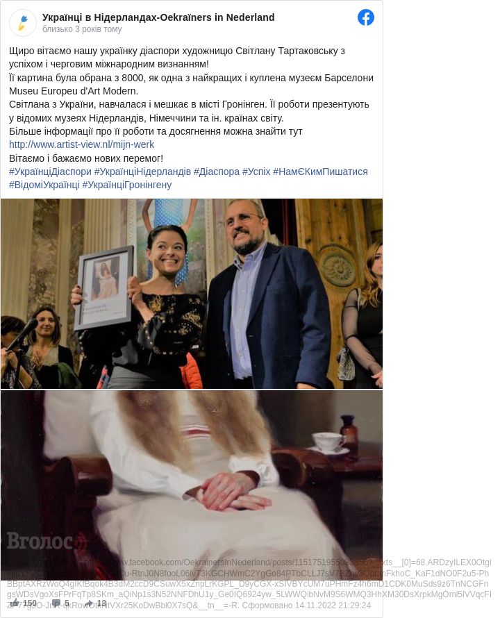 “Щиро вітаємо нашу українку діаспори, художницю Світлану Тартаковську, з успіхом і черговим міжнародним визнанням! Її картина була обрана з 8000 як одна з найкращих і куплена музеєм Барселони Museu Europeu d'Art Modern”, – йдеться у повідомленні.