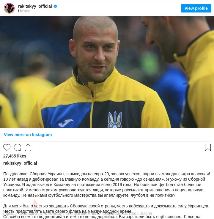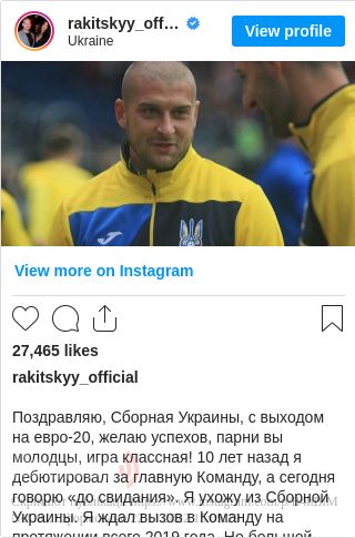 «10 років тому я дебютував за головну команду, а сьогодні говорю »до побачення«. Я йду зі збірної України. Я чекав на виклик у команду протягом усього 2019 року. Але великий футбол став великою політикою. Саме страхом керуються люди, які розсилають запрошення в національну команду. Не навичками футбольної майстерності ви апелюєте. Футбол поза політикою?», - написав він.