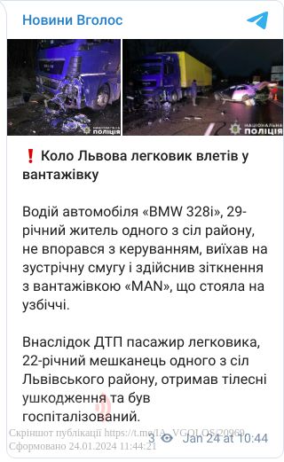 23 січня, близько 16.40, у місті Дубляни Львівського району, водій автомобіля «BMW 328i», 29-річний житель одного з сіл району, не впорався з керуванням, виїхав на зустрічну смугу і здійснив зіткнення з вантажівкою «MAN», що стояла на узбіччі.