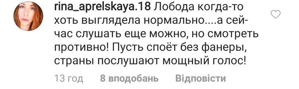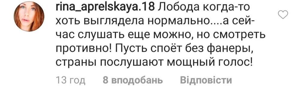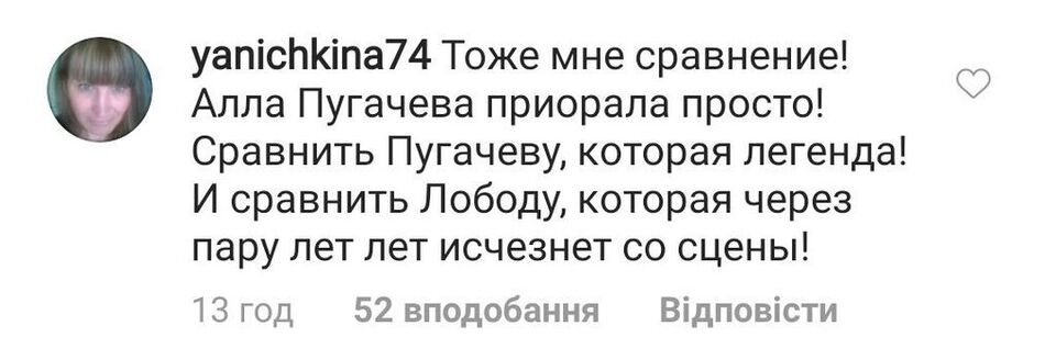 «Фу, Пугачову на заслужений відпочинок», «Дуже негарно сказано», «Лобода колись виглядала нормально, а зараз слухати ще можна, але дивитися гидко», «Як награно і неприродно», - пишуть в мережі.