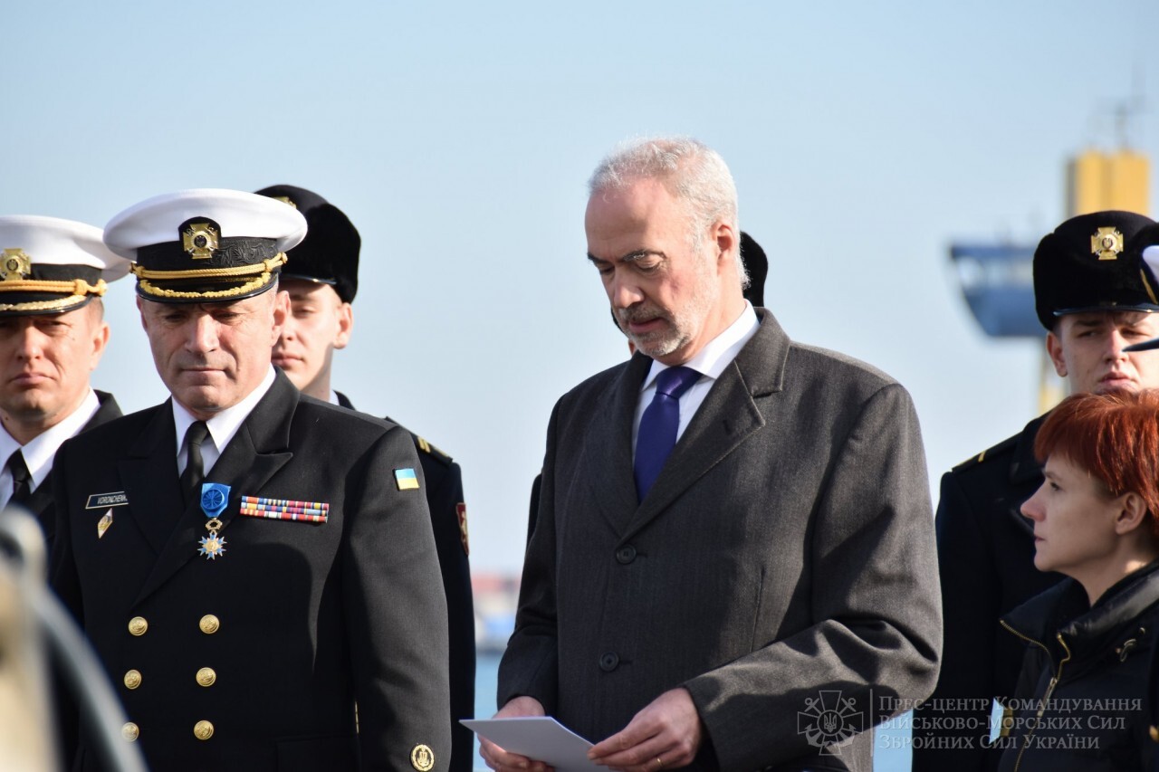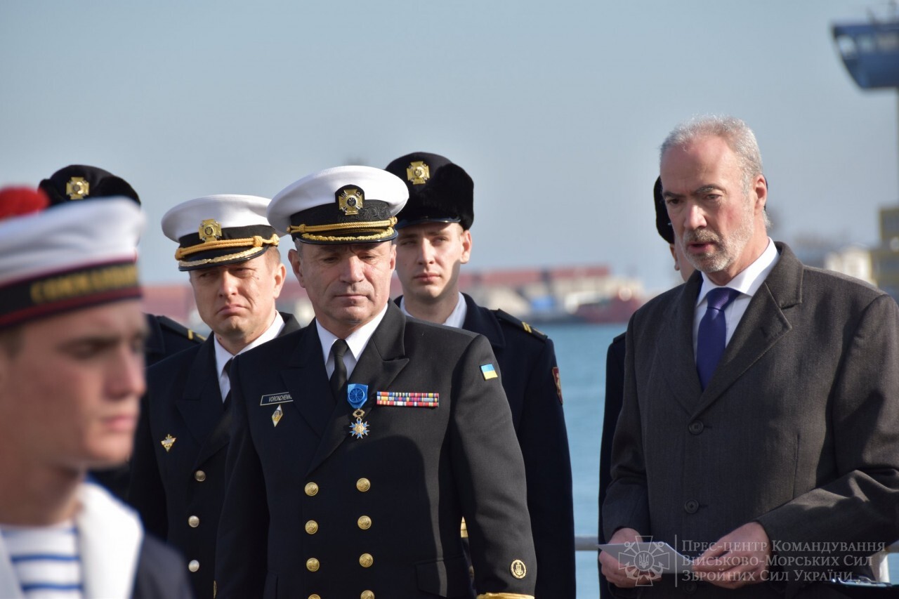 “Національний орден «За заслу́ги», який я мав честь щойно вручити особисто пану адміралу Ігору Воронченку є другим за значущістю у Франції. Президент Франції Емманюель Макрон особисто нагородив пана адмірала цим орденом і це свідчить про повагу, яку він має до українських Військово-Морських Сил. Наша співпраця триває досить давно і зокрема про якісний рівень нашої співпраці свідчить стажування українських кадетів на борту французьких кораблів, зупинки французьких кораблів в Одесі. В майбутньому ми будемо розвивати наші відносини між Військово-Морськими Силами Франції та України”, — заяив посол.