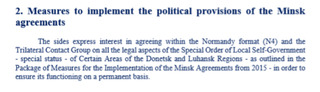 Спочатку було сказано, що "сторони висловлювали зацікавленість в досягненні домовленостей ... з усіх правових аспектів Закону про особливий порядок місцевого самоврядування (особливого статусу) окремих районів Донецької та Луганської областей«.