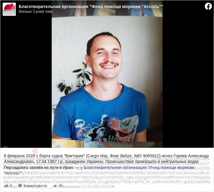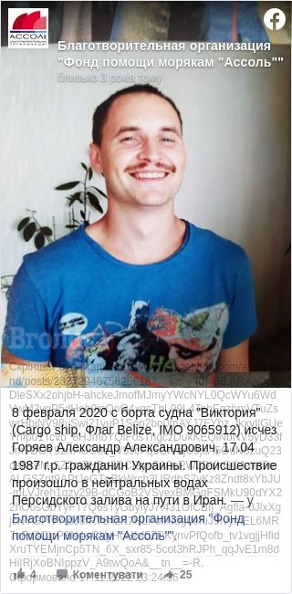 Родичі зниклого моряка розповіли благодійній організації Фонд допомоги морякам Ассоль, що про зникнення їм повідомили лише 13 лютого.