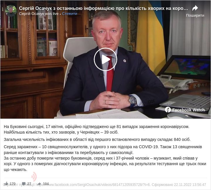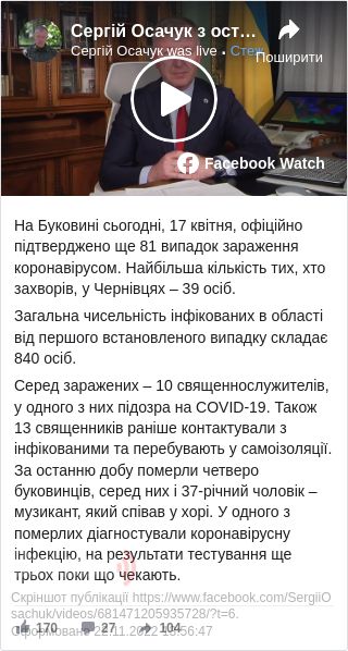 Загалом у Чернівецькій області зафіксовано 840 випадків захворювання коронавірусом.