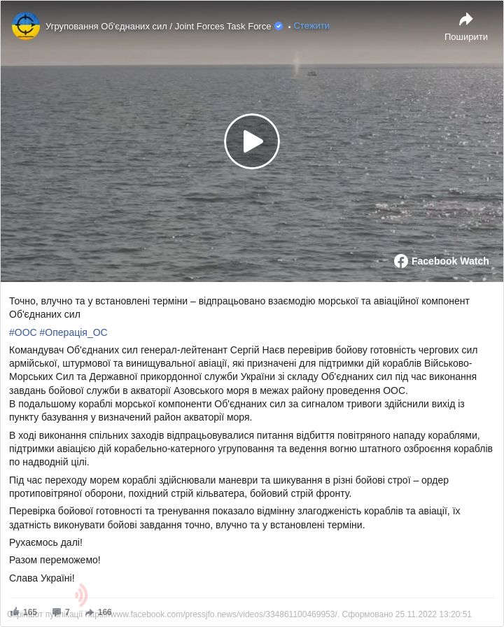 Командувач Об'єднаних сил генерал-лейтенант Сергій Наєв перевів бойову готовність чергових сил армійської, штурмової та винищувальної авіації, що призначені для підтримки дії кораблів ВМС та Держприкордонної служби України зі складу Об'єднаних сил під час виконання бойових завдань бойової служби в Азовському морі в межах проведення ООС.