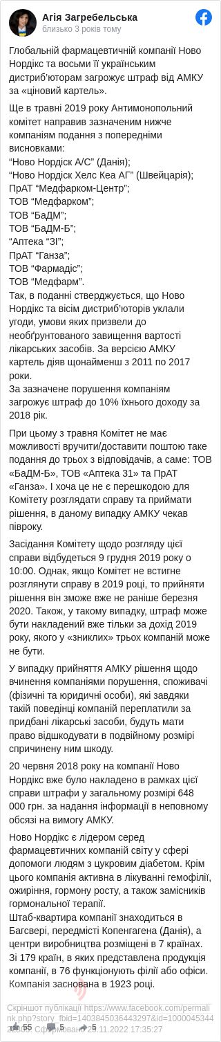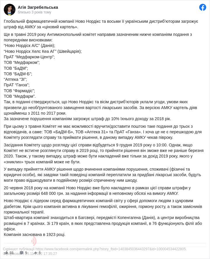 Глобальній фармацевтичній компанії «Ново Нордікс» та її українським дистриб’юторам загрожує штраф від Антимонопольного комітету за «ціновий картель».