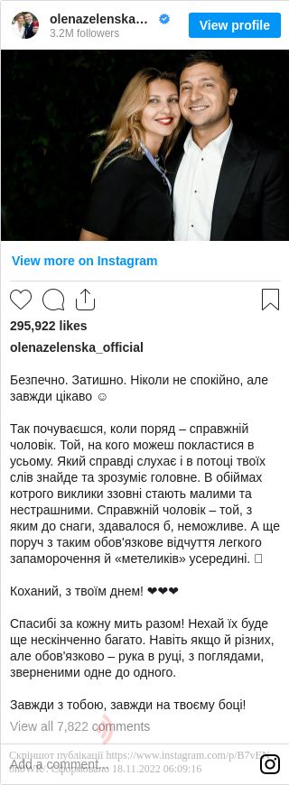 «Безпечно. Затишно. Ніколи не спокійно, але завжди цікаво ☺️ ⠀ Так почуваєшся, коли поряд – справжній чоловік. Той, на кого можеш покластися в усьому. Який справді слухає і в потоці твоїх слів знайде та зрозуміє головне. В обіймах котрого виклики ззовні стають малими та нестрашними. Справжній чоловік – той, з яким до снаги, здавалося б, неможливе. А ще поруч з таким обов'язкове відчуття легкого запаморочення й «метеликів» усередині. ???? ⠀ Коханий, з твоїм днем! ❤️❤️❤️ ⠀ Спасибі за кожну мить разом! Нехай їх буде ще нескінченно багато. Навіть якщо й різних, але обов'язково – рука в руці, з поглядами, зверненими одне до одного. ⠀ Завжди з тобою, завжди на твоєму боці!», - написала Зеленська.