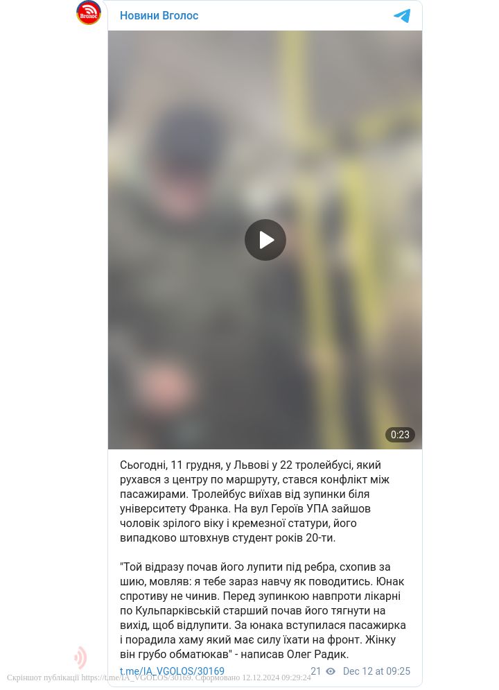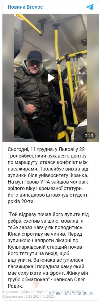 «Той відразу почав його лупити під ребра, схопив за шию, мовляв: я тебе зараз навчу як поводитись. Юнак спротиву не чинив. Перед зупинкою навпроти лікарні по Кульпарківській старший почав його тягнути на вихід, щоб відлупити. За юнака вступилася пасажирка і порадила хаму, який має силу, їхати на фронт», — написав журналіст.