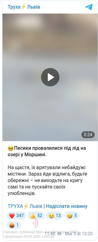 У курортному місті Моршин випадкові перехожі стали свідками надзвичайної події — кілька домашніх улюбленців опинилися у крижаній пастці посеред водойми.