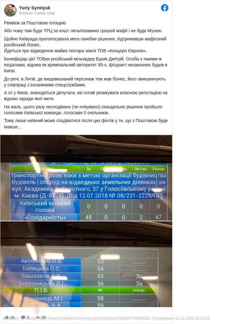 «Реквієм за Поштовою площею. Або чому там буде ТРЦ за кошт легалізованих грошей мафії і не буде Музею. Щойно Київрада проголосувала мегаганебне рішення, підтримавши мафіозний російський бізнес», — розповідає Сиротюк.