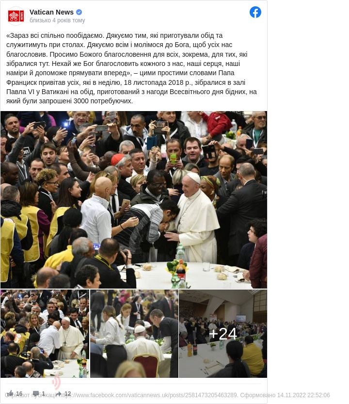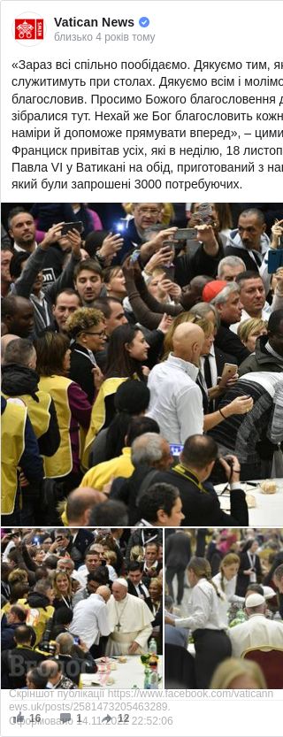 Про це інформує Vatican News."Папа Франциск запросив тисячі будинків у собор Святого Петра для участі в спільному обіді. За його словами, лемент бідних стає все гучнішим, а чують його все менше", — йдеться в повідомленні.