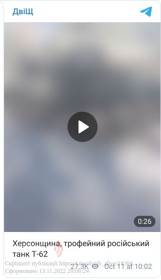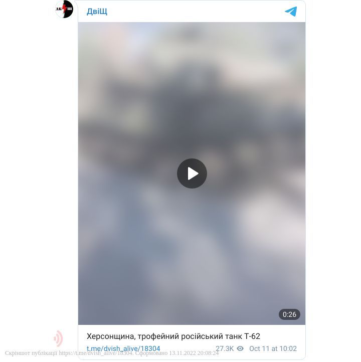У наступному відео військові демонструють трофейний російський танк Т-62. Зазначається, що здобули його на Херсонщині.