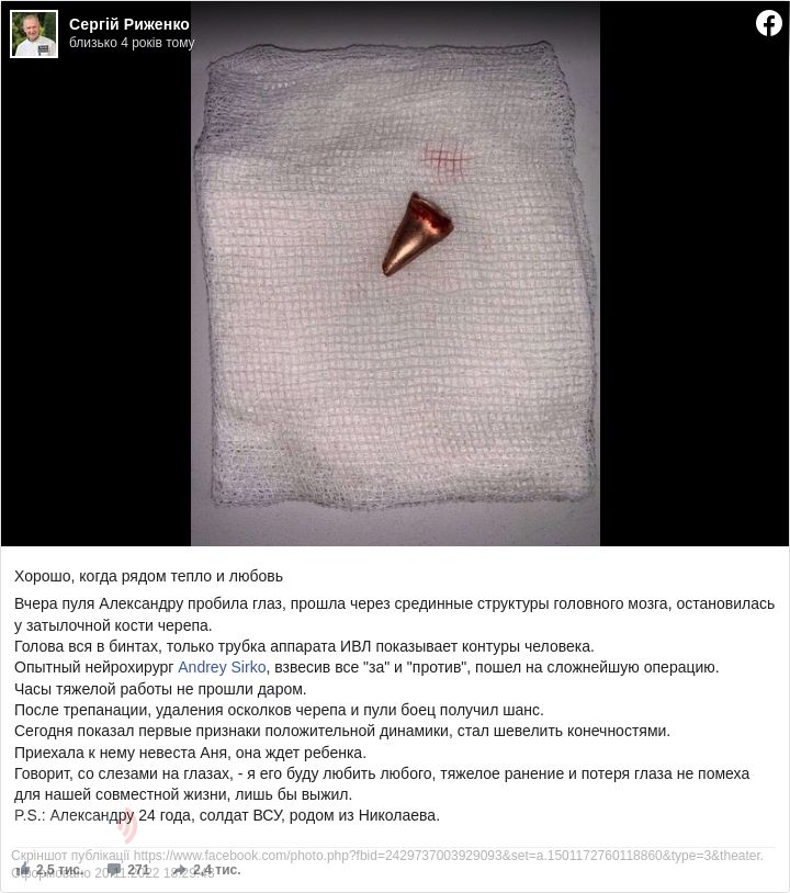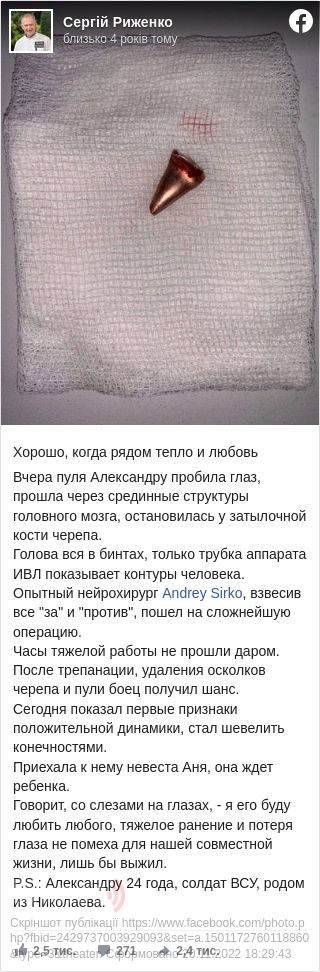 «Добре, коли поруч тепло і любов. Учора куля Олександру пробила око, пройшла через серединні структури головного мозку, зупинилася біля потиличної кістки черепа. Голова вся в бинтах, тільки трубка апарату ШВЛ показує контури людини. Досвідчений нейрохірург Андрій Сірко, зваживши всі «за» і «проти», пішов на складну операцію. Години важкої роботи не минули даремно. Після трепанації, видалення уламків черепа і кулі боєць отримав шанс. Сьогодні показав перші ознаки позитивної динаміки, почав ворушити кінцівками. Приїхала до нього наречена Аня, вона вагітна. Каже, зі сльозами на очах, я його кохатиму будь-якого, важке поранення і втрата ока – не перешкода для нашого спільного життя, аби вижив. Олександру 24 роки, солдат ЗСУ, родом із Миколаєва», – розповів Риженко.