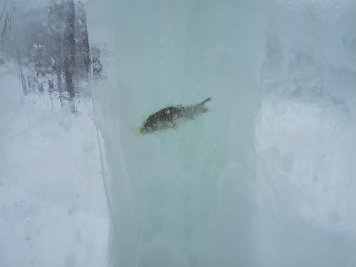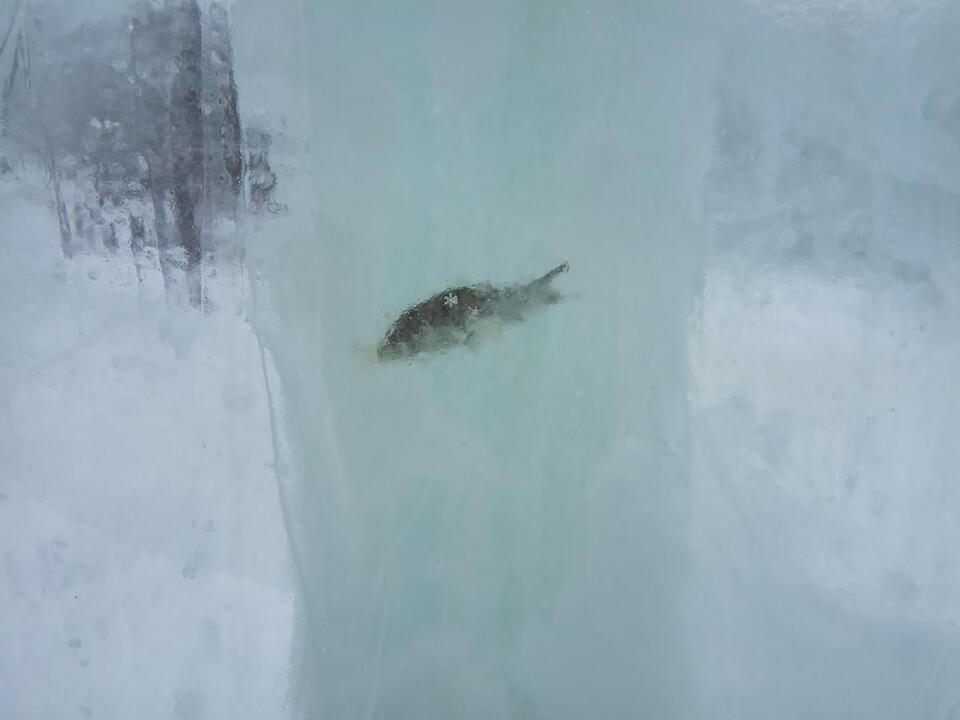 Повідомляється, що в місті створили новорічне крижане містечко. Як виявилося, в скульптурах, які обробили, замерзла риба.
