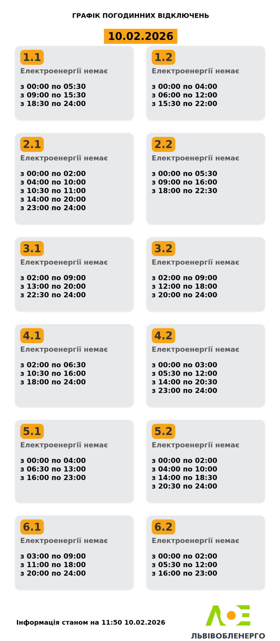 Група 6.2. Електроенергії немає з 00:00 до 02:00, з 05:30 до 12:00, з 16:00 до 23:00.
