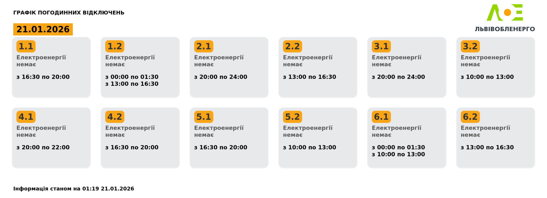 У середу, 21 січня, на Львівщині діятимуть графіки відключення світла. Електроенергію будуть вимикати усім групам.