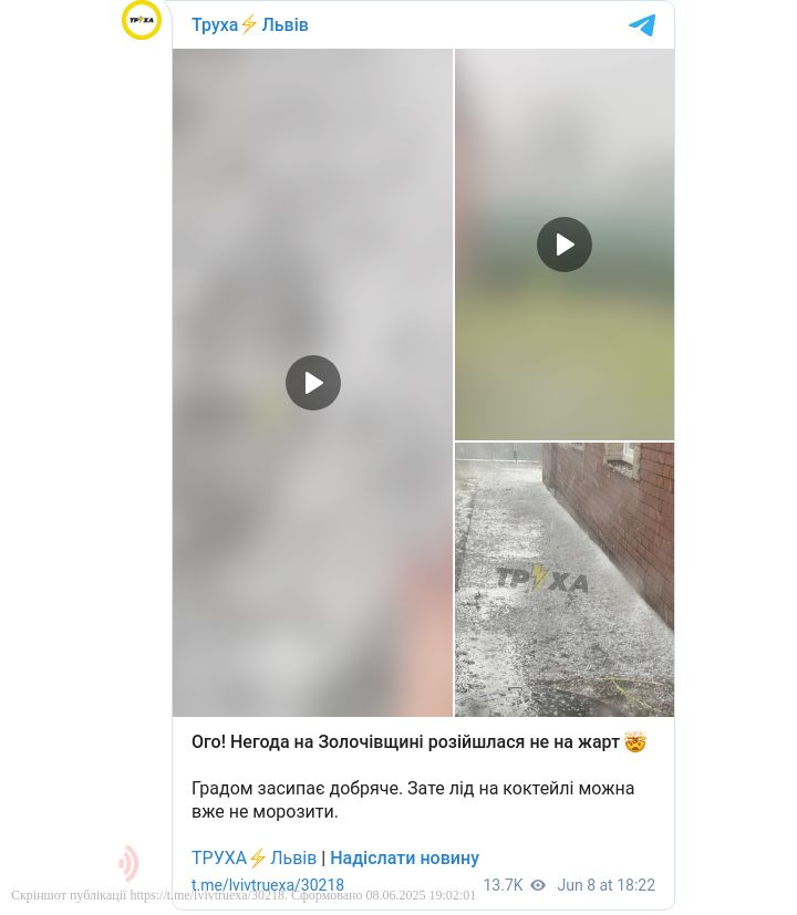 Сьогодні, 8 червня, Львівщину накрила негода: дощ із градом зафіксували у Золочівському районі.