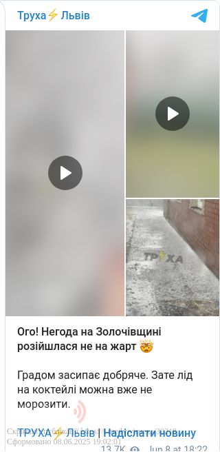 Користувачі повідомляють про сильний град, який сипав настільки рясно, що, як жартують у мережі, «лід на коктейлі можна вже не морозити».