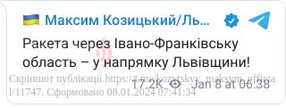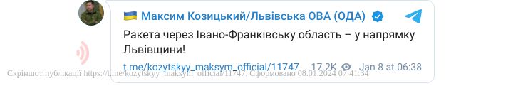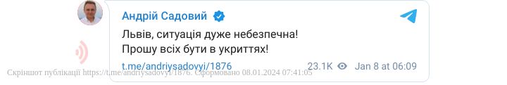 У понеділок, 8 січня, з 6:00 по Україні почала ширитися повітряна тривога. Повітряні сили підтвердили пуски ракет з російських стратегічних бомбардувальників Ту-95МС і винищувачів МіГ-31К. Є загроза для Львівщини.