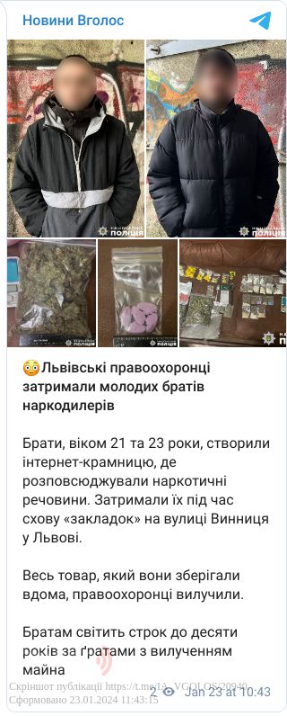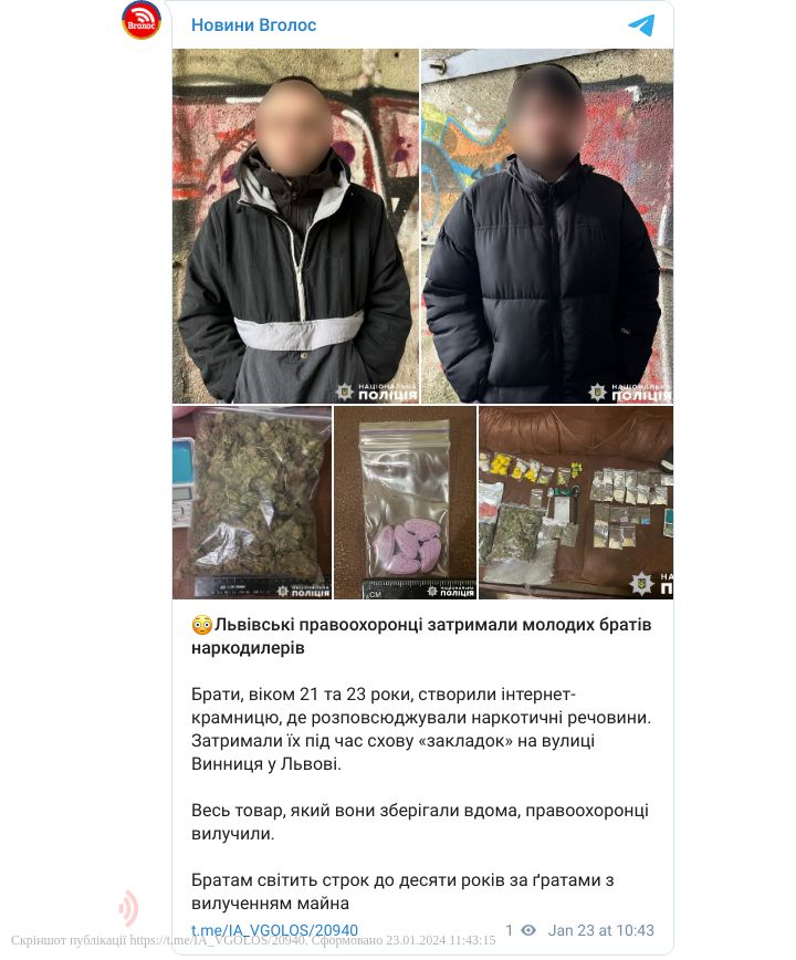 Брати, віком 21 та 23 роки, створили інтернет-крамницю, де розповсюджували наркотичні речовини. Затримали їх під час схову «закладок» на вулиці Винниця у Львові.