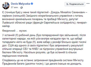 Зокрема він повідомив, що нещодавно був затриманий його вже колишній підлеглий, генерал - майор Михайло Дзюдзь, який був очільником Західного міжрегіонального управління з питань виконання кримінальних проваджень та пробацій Мін'юсту, депутатом Львівської обласної ради від партії «Європейська солідарність» у зв'язку з отриманням неправомірної вигоди у розмірі 1 тисяча доларів від свого підлеглого.