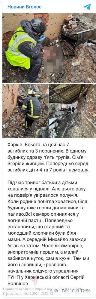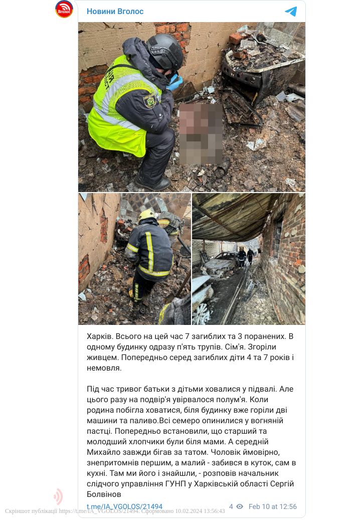 Після нічного російського обстрілу Харкова в одному з приватних житлових будинків внаслідок пожежі загинула вся родина з 5 людей: чоловік з дружиною та троє їхніх дітей – семирічний, чотирирічний та семимісячний хлопчики.