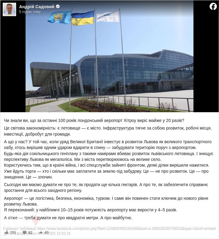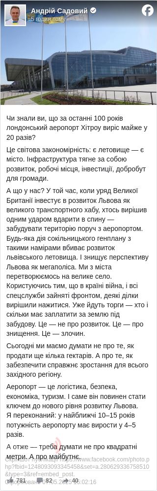 У соціальних мережах Садовий порівняв львівське летовище з аеропортом Хітроу (Лондон), який за 100 років виріс у 20 разів, і наголосив, що аеропорт є ключем до розвитку міста. «Інфраструктура тягне за собою робочі місця, інвестиції, туризм. У найближчі 10–15 років потужність аеропорту має вирости у 4–5 разів», — заявив він.