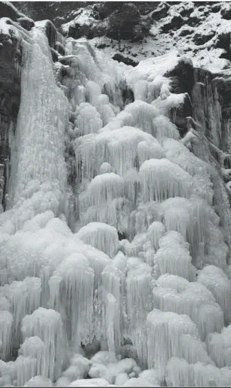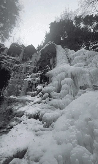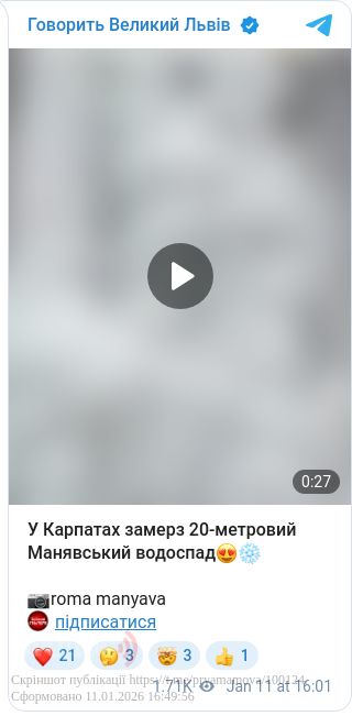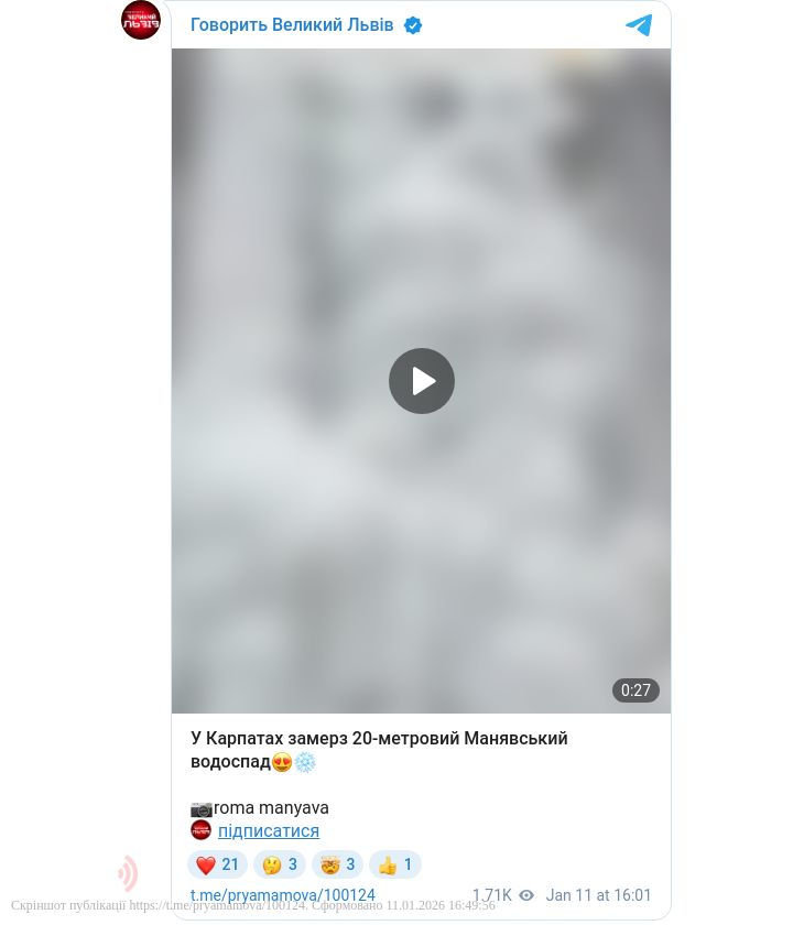 На оприлюднених кадрах видно, як туристи фотографуються біля замерзлого водоспаду, який повністю скував лід.