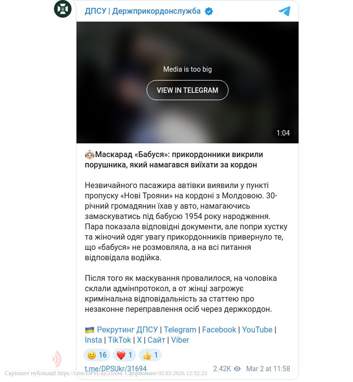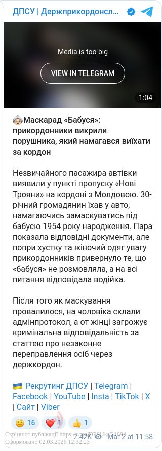 Під час огляду автомобіля, що прямував до Молдови, увагу охоронців кордону привернула «пасажирка» у хустці та жіночому одязі. Згідно з наданими документами, це мала бути жінка 1954 року народження. Однак «бабуся» поводилася підозріло: вона зберігала повне мовчання, а на всі запитання прикордонників замість неї відповідала водійка.