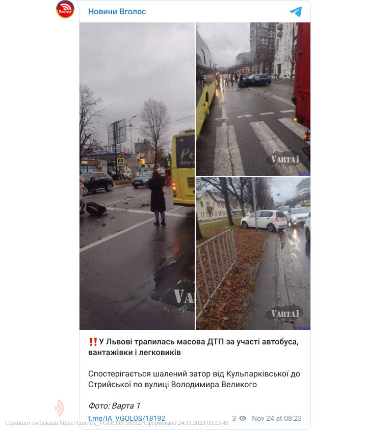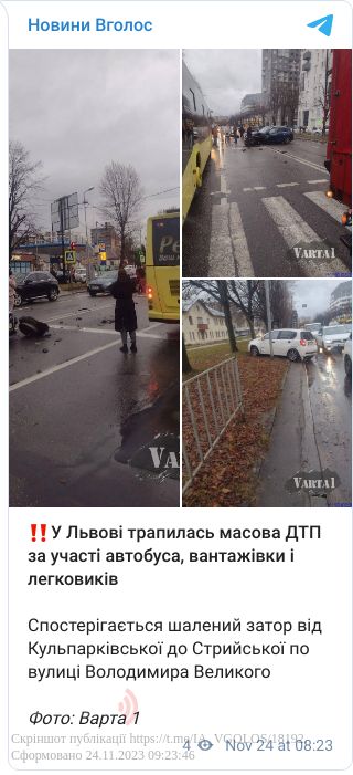 Зранку 24 листопада о 08:50 у Львові сталася дорожньо-транспортна пригода за участю декількох транспортних засобів, в тому числі автобуса.