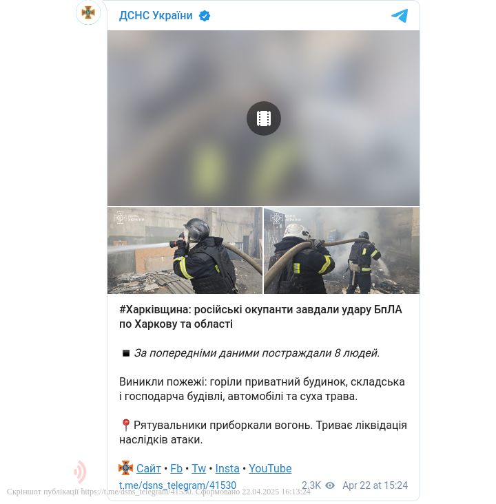 Російські війська вдень 22 квітня здійснили масовану атаку ударними дронами по Харкову та населених пунктах області. Внаслідок обстрілів зафіксовано жертви, поранення та значні руйнування.