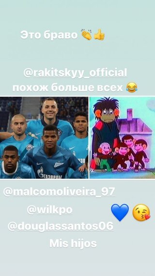 Нападник »Зеніта« поділився фотоколажем, на якому він разом з Ярославом Ракицьким та темношкірими легіонерами пітерського клубу позують перед матчем. Поруч із фото був мультиплікаційний кадр із мавпами.