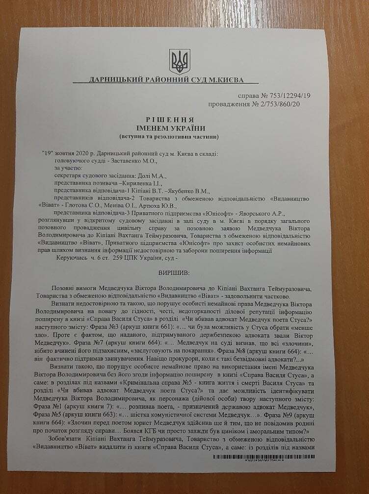 - У понеділок, 19 жовтня, Дарницький районний суд Києва заборонив розповсюдження тиражу книги Вахтанга Кіпіані “Справа Василя Стуса” без дозволу одіозного Віктора Медведчука.