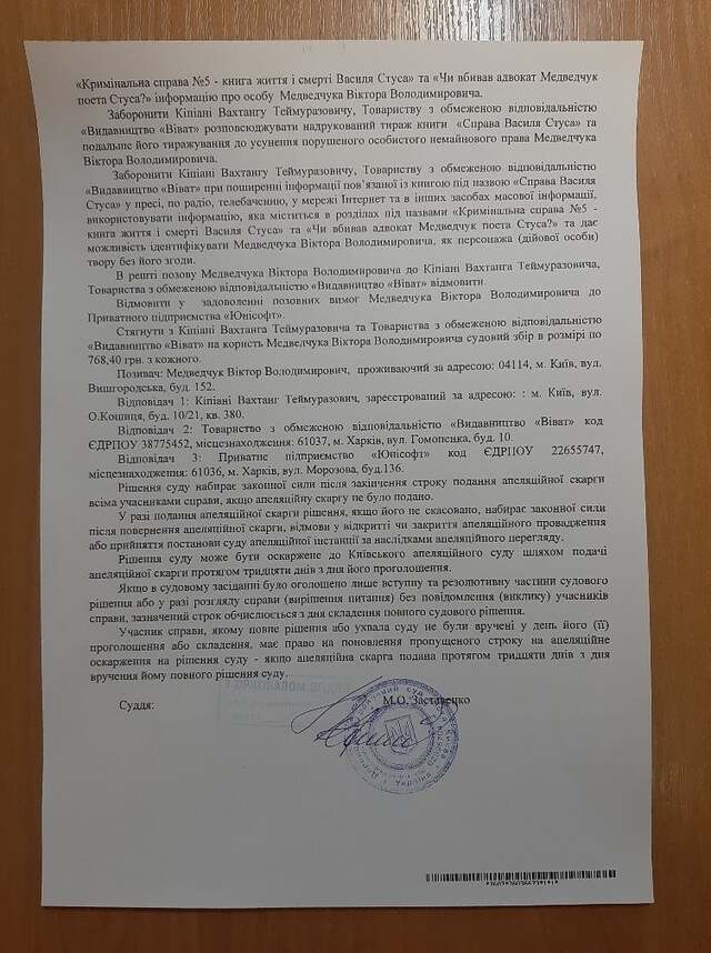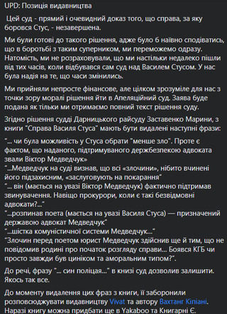 Маркетинг-директорка видавництва Vivat, яке опублікувало книгу Вахтанга Кіпіані «Справа Василя Стуса», Катерина Адамчук прокоментувала рішення Дарницького районного суду щодо заборони розповсюдження книги без дозволу депутата від ОПЗЖ Віктора Медведчука.