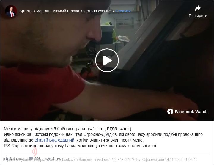 Пізно ввечері 18 червня Семеніхін вийшов у прямий ефір на своїй публічній сторінці у Facebook «Артем Семеніхін – міський голова Конотопа» зі свого гаража і повідомив, що виявив у власному автомобілі бойові гранати.