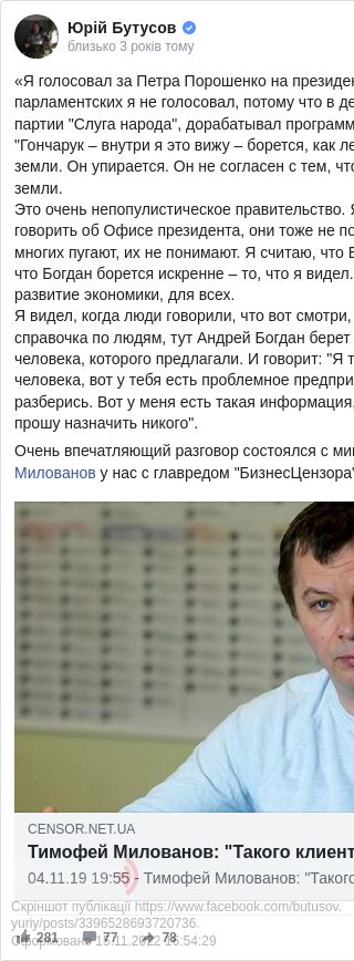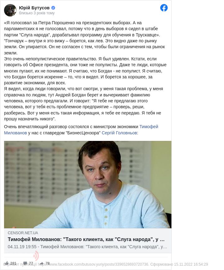 Міністр розвитку економіки України Тимофій Мілованов на виборах президента України у 2019-му голосував за Петра Порошенка.