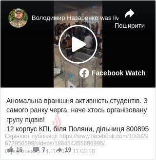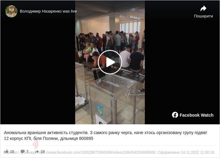 За словами депутата, молоді люди зайшли на дільницю організованою групою і підходять лише до двох столів для отримання бюлетенів. У нього виникла підозра, що хтось намагається сфальсифікувати вибори за допомогою підкупу студентів.