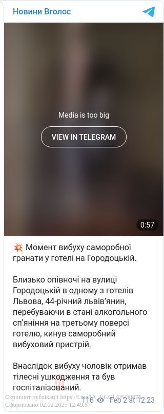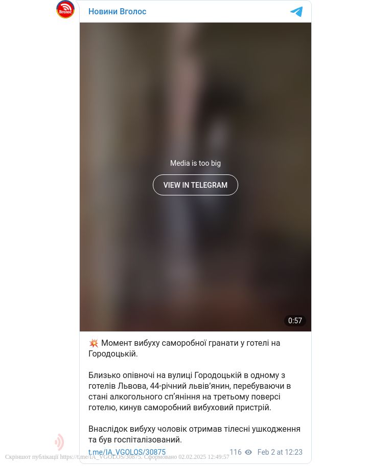 У мережі опублікували момент відео саморобної гранати у готелі на Городоцькій.