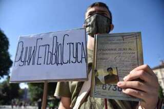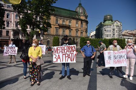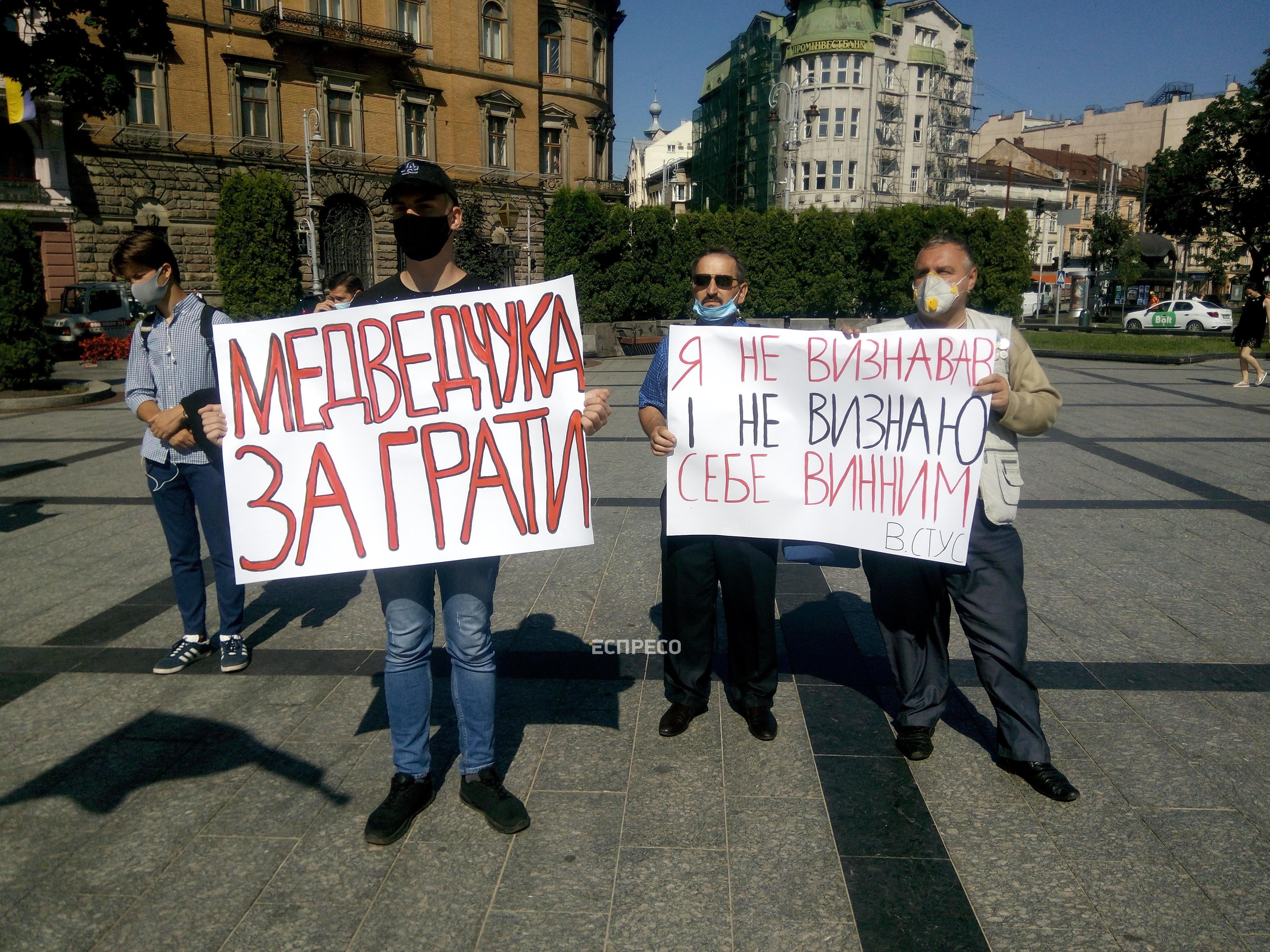 У Львові десятки людей вийшли на акцію протесту через позов до суду народного депутата України, члена партії «ОПЗЖ» Віктора Медведчука проти журналіста, історика Вахтанга Кіпіані та видавництва «Vivat».